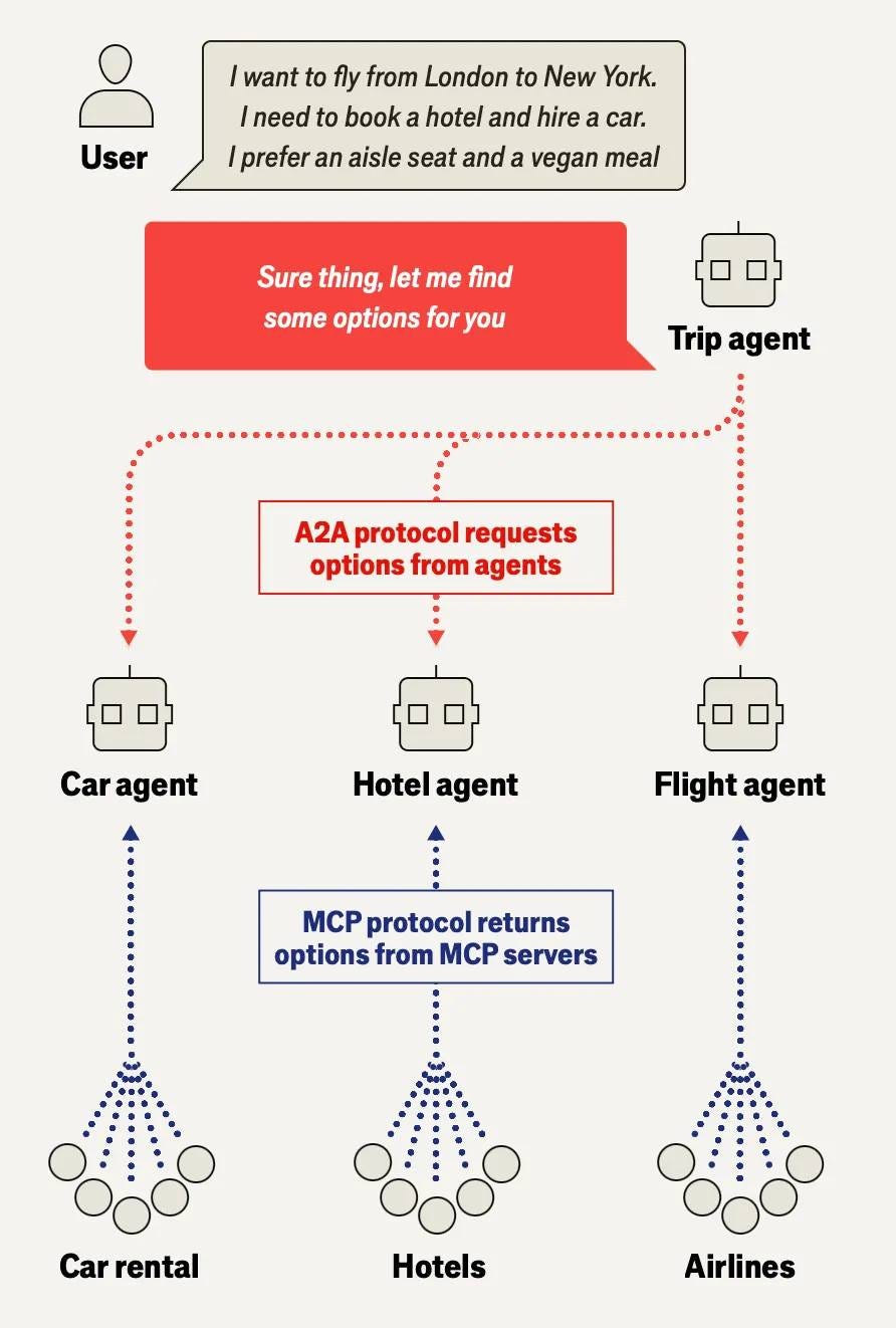 将来は、「ロンドンからニューヨークへ、通路側の座席で、ヴィーガン食、さらにレンタカーとホテルも手配してほしい」と一言伝えるだけで、複数のエージェントが自動的に役割分担し、航空会社、ホテル、レンタカーサービスのシステムと連携しながら選択肢を整理し、予約まで完了させる世界が訪れるだろう。