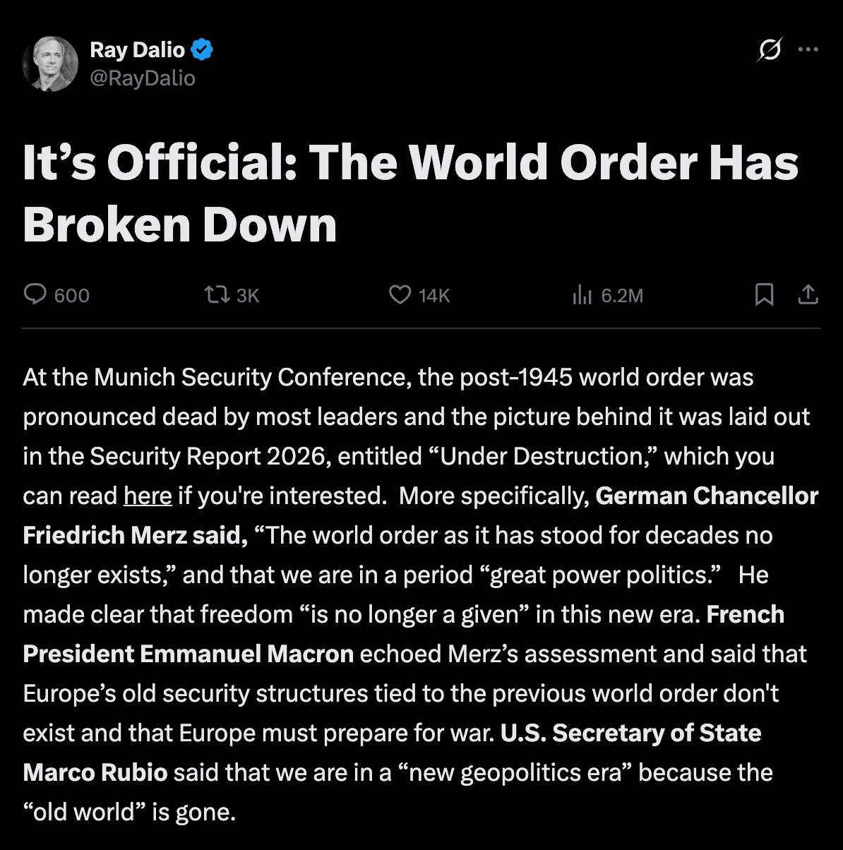 Ray Dalioによる一万字を超える長文 『世界秩序はすでに崩壊した――これは公式な宣言である』