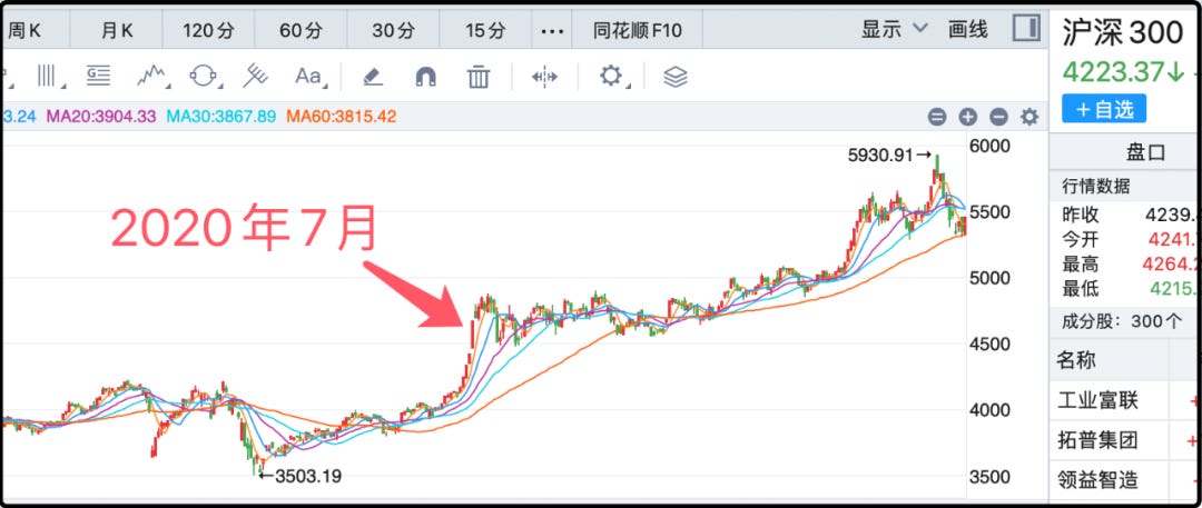 現在の相場はすでにかなり熱を帯びた状態です。昨日のA株の融資純買入額は393.24億元に達しました。簡単に説明すると、この数字は個人投資家が証券会社からお金を借りて株を買った額を示すもので、昨日は歴史上で3番目に高い水準でした。リストを見ると、1位、2位、4位はいずれも昨年9月の相場で、表の半分は2015年の牛市、残りは2020年7月初旬に起きたものです。当時を振り返ると、中国全土が新型コロナの最初の厳しいロックダウンを経験しており、夏の暑さで人々は2003年のSARSのように感染を克服したと思い、経済活動が回復、金融政策も刺激的で、株式市場は大きく動きました。