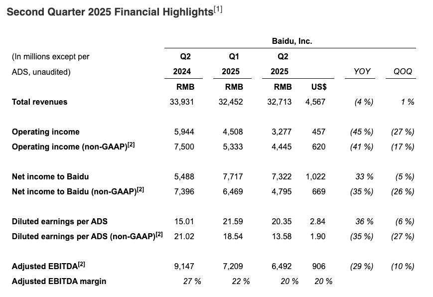 百度の全体売上は4%減少し、コアのオンラインマーケティング売上は前年同期比で15%減の162億元、AIクラウド売上は前年同期比27%増の65億元となりました。営業利益は45%減少しました。